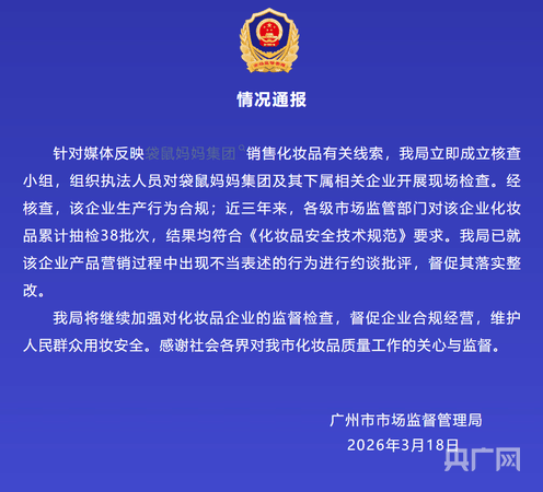 央广网广州3月18日消息(记者郑(zheng)少纯)3月18日晚(wan),广州市市场监督管理局发布情况(kuang)通报。针对媒体反映袋(dai)鼠妈妈集团销售化妆品有关线(xian)索,该局立即成立核(he)查小(xiao)组,组织(zhi)执法人员(yuan)对袋(dai)鼠妈妈集团及(ji)其下属(shu)相关企(qi)业开(kai)展(zhan)现场检查。