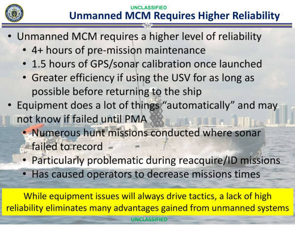 另一张PPT,利用AN/AQS-20水雷(lei)探测系统(tong)进行水雷(lei)的视觉(jue)确认也颇具(ju)挑战性,“即使(shi)是在相对清静的南加州水域也简单出错”。该简报还强调(diao)了模块中包含的扫雷(lei)系统(tong)以及安排和回收这些系统(tong)所(suo)需设备的多个潜(qian)伏“单点故障”。