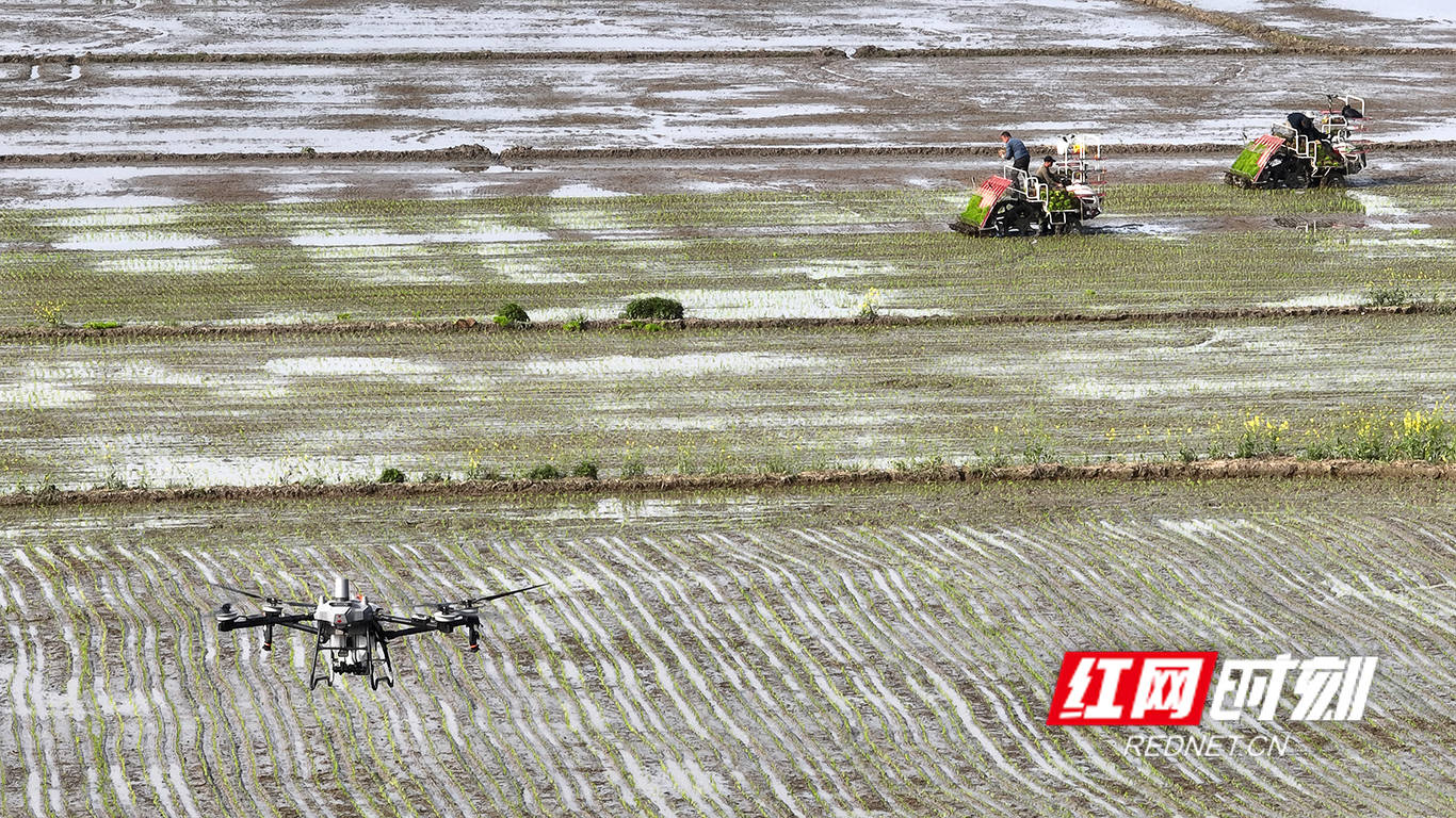 4月1日,望城区高塘岭街道新(xin)河(he)村(cun),四祥生态种养(yang)专业合作社的早稻(dao)田里,无人(ren)机精准播种、高速插秧机同步栽(zai)插,“空中+地面”双(shuang)机协同,让望城早稻(dao)栽(zai)培跑出“加速度(du)”。