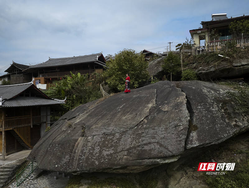 12月2日,怀化翁(weng)朗溪村(cun),瑶族村(cun)民杨(yang)艳梅站正在村(cun)中巨(ju)石之上(shang),身后是(shi)依山而(er)建的民居与山林。返(fan)乡创业后,她将自家衡宇改造为民宿农家乐,用直(zhi)播展示瑶乡风光与墟落生活,成为墟落振兴(xing)路上(shang)的点点星光。