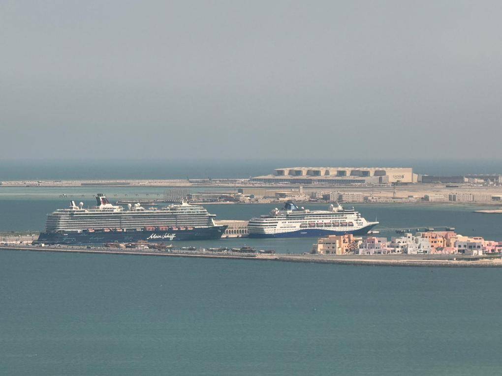 这是3月6日在卡塔尔(er)首都(dou)多哈的(de)港口拍摄的(de)滞(zhi)留的(de)“迈希夫五号(hao)”邮轮(左)(手机(ji)照片)。新华社记者汪强摄